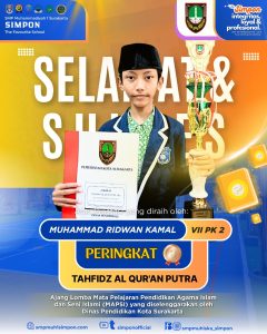 SMP Muhammadiyah 1 Surakarta (SIMPON) kembali menorehkan prestasi membanggakan. Salah satu siswanya, Muhammad Ridwan Kamal dari kelas VII PK 2, berhasil meraih Juara III cabang Tahfidz Al-Qur’an Putra dalam Ajang Lomba Mata Pelajaran Pendidikan Agama Islam dan Seni Islami (MAPSI).