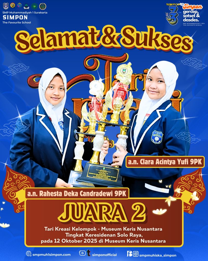 Surakarta, 15 Oktober 2025- Bu SiLPi kembali mengangkat prestasi baru siswi SMP Muhammadiyah 1 Simpon Surakarta. Pretasi yang muncul kali ini dari siswi An. Rahesta Deka Candradewi dan An. Clara Acintya Yufi kelas 9PK yang berhasil meraih juara 2 Tari Kreasi Kelompok – Museum Keris Nusantara.