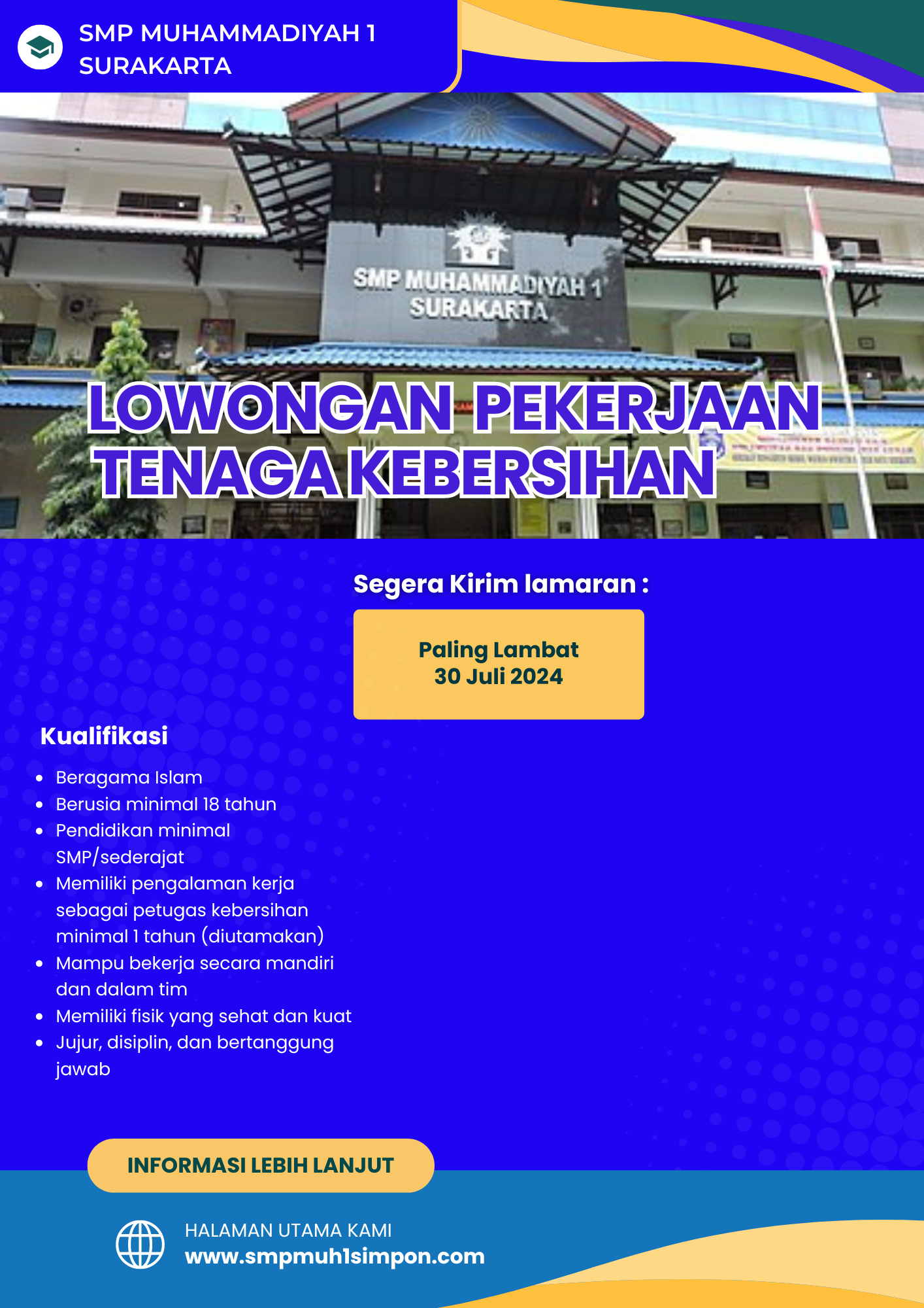 SMP Muhammadiyah 1 Simpon membuka lowongan pekerjaan untuk posisi Petugas Kebersihan. Posisi ini terbuka untuk laki-laki dan perempuan muslim / muslimah yang memiliki semangat kerja keras, disiplin, dan bertanggung jawab.