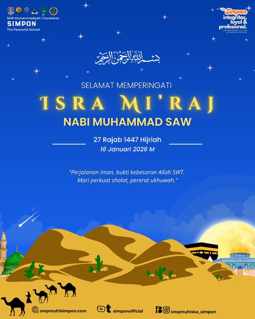 Surakarta, 15 Januari 2026- Sebelum pulang sekolah semua peserta didik SMP Muhammadiyah 1 Simpon Surakarta menyaksikan video dari Kisah Isra’ Mi’raj Nabi Muhammad Rasulullah SAW. Kegiatan ini dalam rangka memperingati Isra’ Mi’raj Nabi Muhammad Rasulullah SAW yang akan jatuh pada 27 Rajab 1447H. Tidak terkecuali bersama guru dan tenaga kependidikan yang mendampingi kegiatan tersebut.