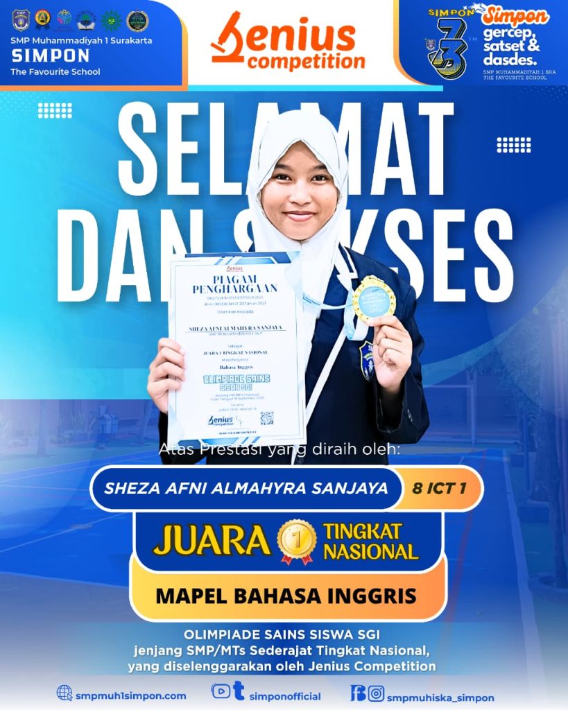 Surakarta, 8 Oktober 2025 : Seruan prestasi terus diukir oleh siswa SMP Muhammadiyah 1 Simpon Surakarta. Berita prestasi kali ini datang dari bidang Bahasa Inggris.