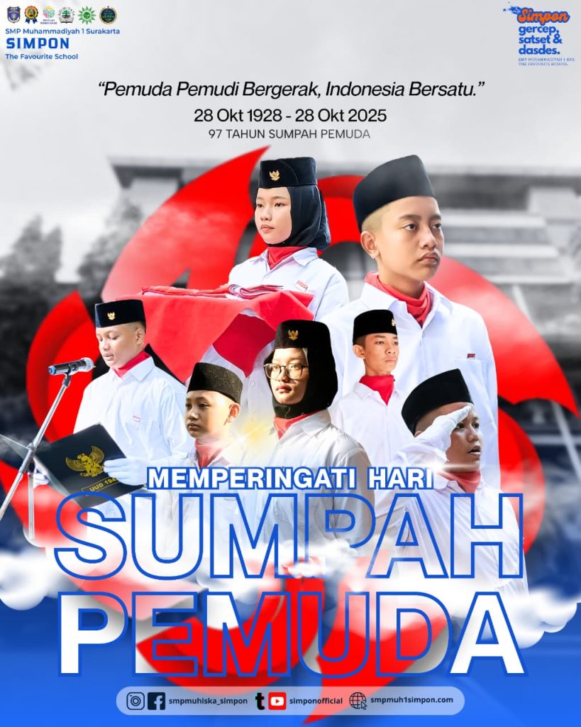 Surakarta, 28 Oktober 2025 : Seluruh warga Indonesia, dari semua kalangan serta semua kedudukan Dalam rangka memperingati Hari Sumpah Pemuda ke-97, SMP Muhammadiyah 1 Surakarta menggelar serangkaian kegiatan bertema “Pemuda Pemudi Bergerak, Indonesia Bersatu” pada Selasa pagi (28/10). Kegiatan ini berlangsung dengan khidmat di halaman sekolah dan diikuti oleh seluruh siswa, guru, serta staf sekolah.