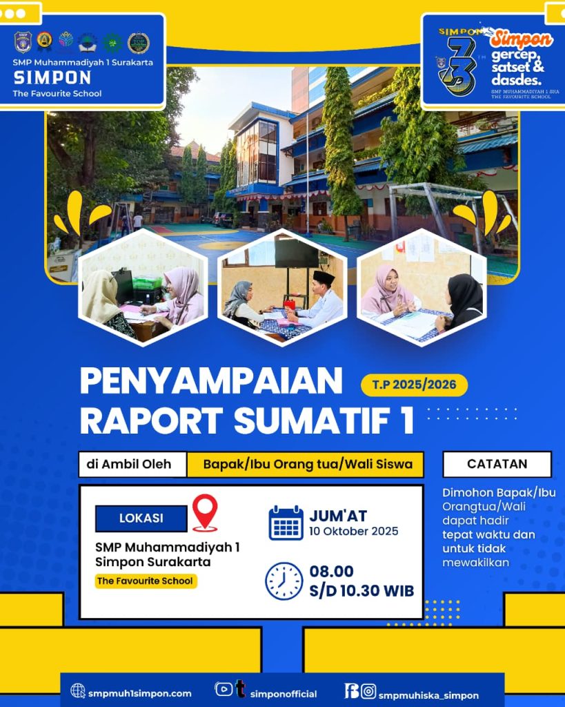 Surakarta, 10 Oktober 2025 : SMP Muhammadiyah 1 Surakarta The Favorite School, pada bulan ini sekolah melaporkan hasil pembelajaran siswa, serta capaian program yang diikuti dalam satu kegiatan yakni Penyampaian Rapot Sumatif 1.