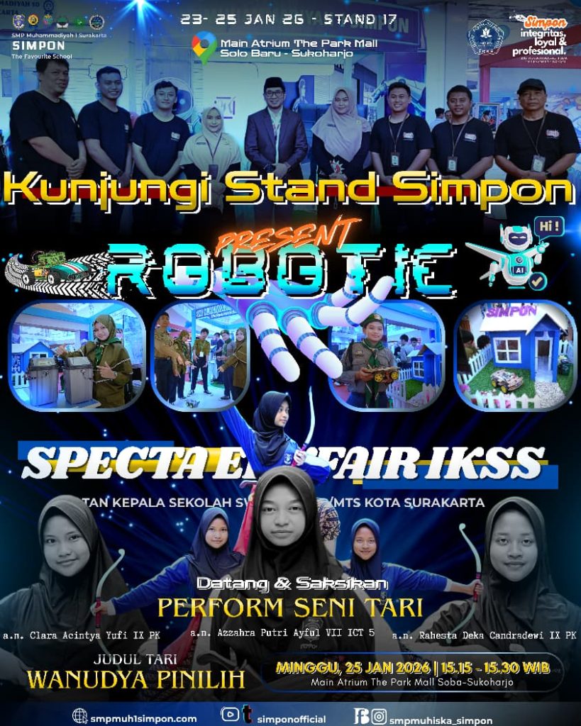 Surakarta, 25 Januari 2026- Sinergi Keanggunan dan Ketangguhan: Tari Wanudya Pinilih Siswi SMP Simpon Memukau di SPECTA EDUFAIR 2026. Main Atrium The Park Mall Solo Baru menjadi saksi bisu kemeriahan gelaran SPECTA EDUFAIR yang diinisiasi oleh Ikatan Kepala Sekolah Swasta (IKSS) SMP/MTs Kota Surakarta. Event yang berlangsung selama tiga hari, 23-25 Januari 2026, ini menjadi ajang unjuk gigi bagi sekolah-sekolah swasta unggulan. Salah satu penampilan yang paling menyedot perhatian pengunjung adalah aksi seni tari dari perwakilan SMP Muhammadiyah 1 (Simpon) Surakarta.